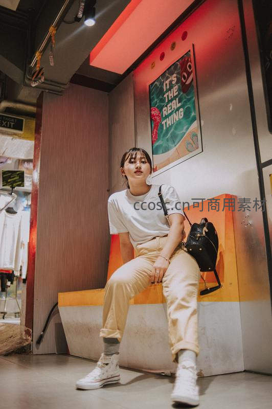 一位穿着简约白色T恤和米色长裤的年轻女孩,背着黑色小包,坐在一家设计感十足的店铺橙色台阶上,背景墙上挂着潮流海报,整体氛围现代而休闲。