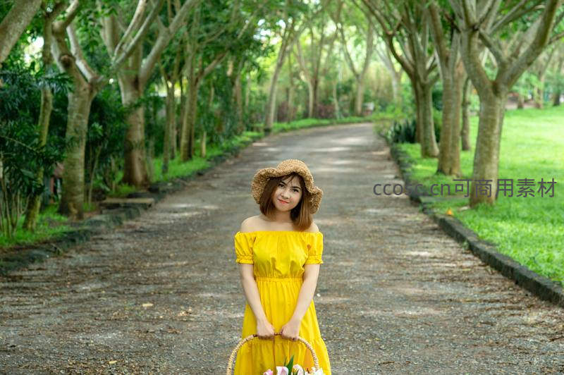一位身穿鲜黄色露肩连衣裙的少女,手提一篮鲜花,站在两旁树木成行的林荫小径中央,面带微笑望向镜头,阳光透过树叶洒下斑驳光影,充满田园诗意。