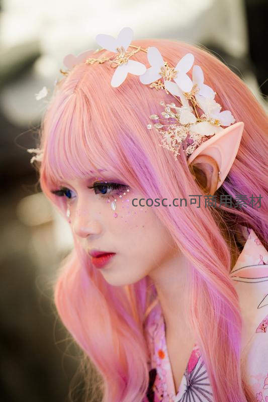 粉发精灵耳少女,花冠点缀梦幻妆容