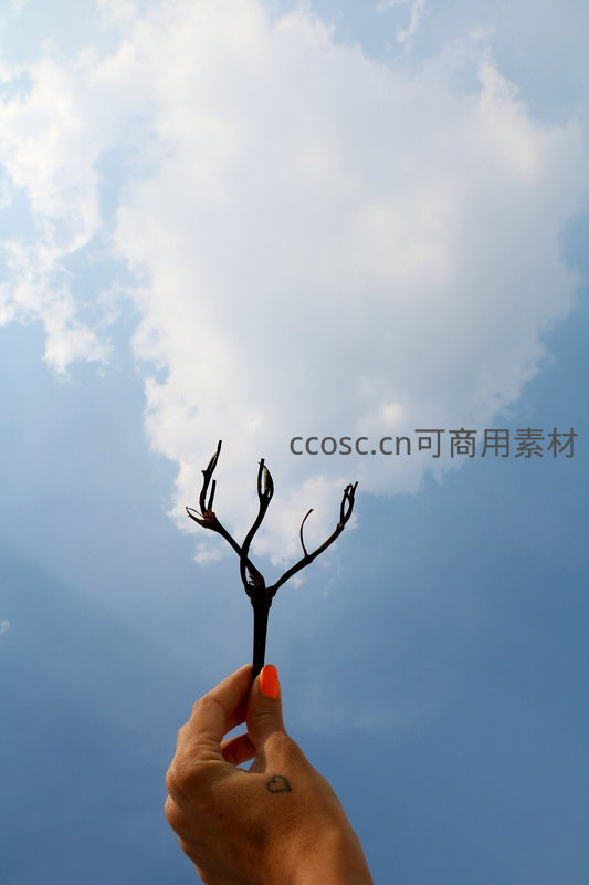 一只涂着橙色指甲油的手轻轻托举着一根干枯的树枝,背景是广阔无垠的蓝天和蓬松的白云,充满诗意与哲思。