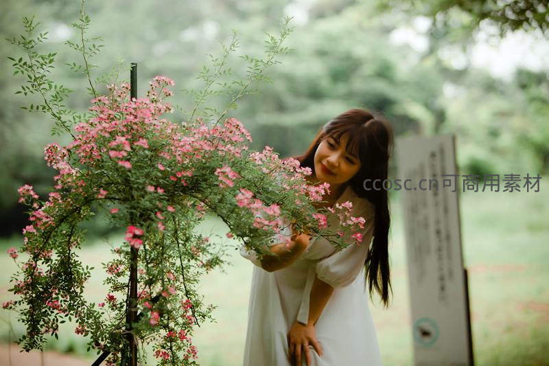 身穿白色连衣裙的女孩在绿意盎然的公园里,俯身轻抚一簇盛开的粉色小花,脸上洋溢着温柔的笑容,营造出宁静美好的自然氛围。