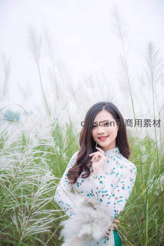 一位面带甜美笑容的旗袍女子站在白絮飘扬的芦苇田中,手持芦花轻触脸颊,阳光柔和,画面温馨浪漫,传递出宁静与喜悦的情感。