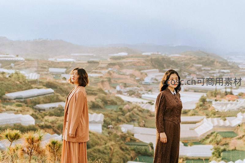 两名女子并肩站在山丘上,身后是连绵起伏的山峦和成片的温室大棚,她们静静凝视远方,画面宁静而富有诗意,展现了人与自然和谐共处的景象。