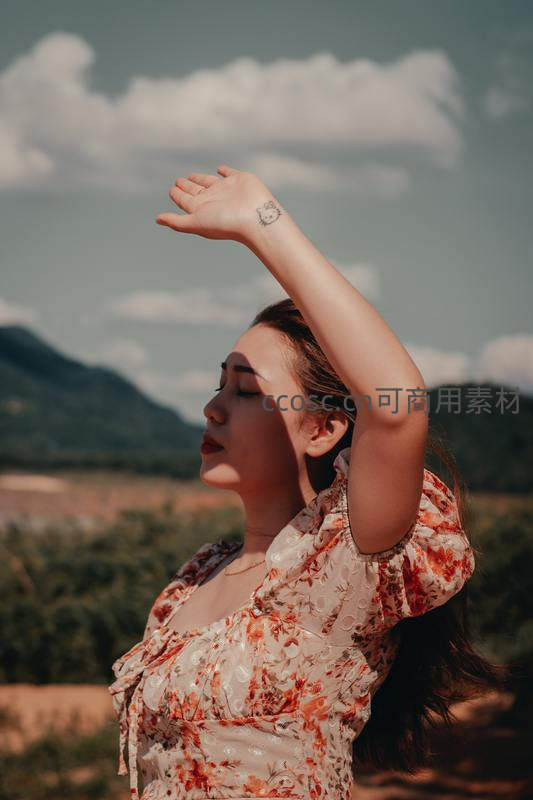 女子身穿碎花连衣裙,在开阔山野中闭目抬手感受微风,阳光洒落,远山如黛,传递出无拘无束、拥抱自然的惬意感。
