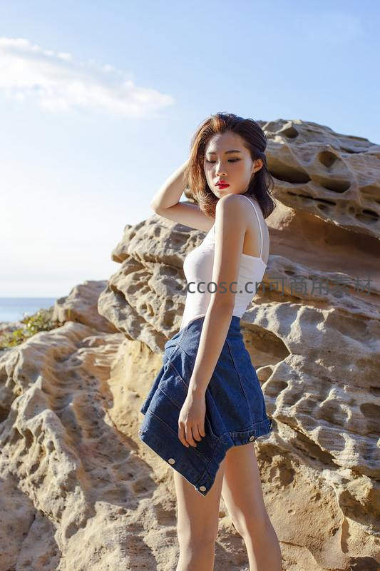 一位年轻女子身着白色上衣与牛仔短裙,倚靠在海边风化的岩石旁,阳光洒落,勾勒出她优雅的轮廓,尽显夏日的清新与活力。