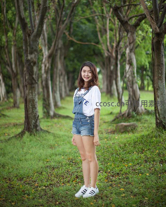 少女站在绿意盎然的林间草地上,穿着白色T恤和牛仔背带短裤,脚踩白色运动鞋,对着镜头绽放灿烂笑容,充满青春活力的气息。
