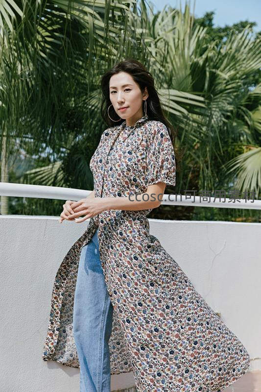 一位女士身着飘逸的碎花长裙,站在种满热带植物的阳台边,微风轻拂裙摆,她姿态优雅,展现出与自然融为一体的浪漫与闲适。
