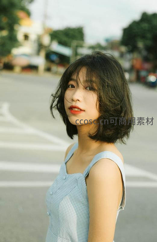 一位留着俏皮短发的女孩站在街头,身穿浅色格子连衣裙,回头望向镜头,眼神清澈,背景虚化突出主体,尽显清新自然气质。