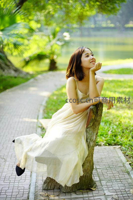 公园树桩上的优雅少女,阳光洒落如画