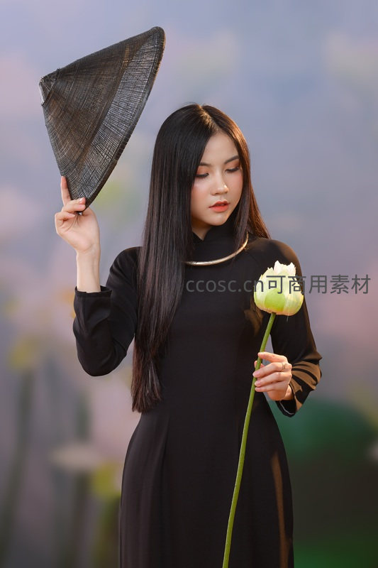 身着黑色奥黛的女子手持斗笠与含苞莲花,姿态端庄,背景朦胧如水墨画,尽显东方古典韵味与内敛优雅的女性魅力。