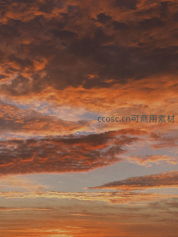 夕阳西下,天空被燃烧般的橙红色云层所覆盖,层层叠叠,营造出温暖而梦幻的黄昏氛围。