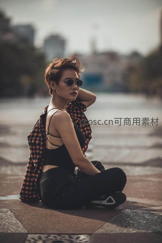 短发女孩戴着圆形墨镜,身穿黑色背心与格子衬衫随意搭在肩上,坐在城市广场的地砖上,姿态随性,展现出都市青年的个性与潮流感。
