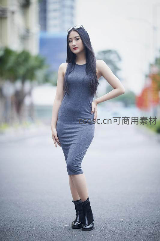 身穿修身灰色无袖连衣裙,脚踩黑色短靴,长发披肩立于城市街道,展现现代都市女性的简约干练风格。