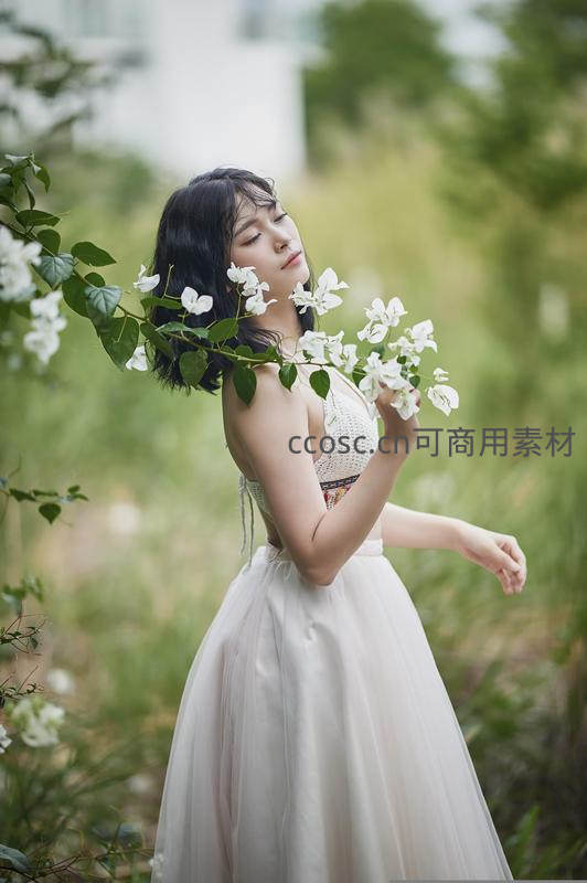 一位身穿白色纱裙的女子在花丛中闭目沉思,微风轻拂发丝,白花环绕肩头,画面宁静而富有诗意,传递出与自然融为一体的恬淡之美。