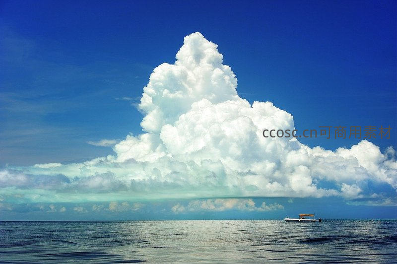 碧海蓝天之下,一朵巨大的积雨云如山峰般耸立,远处一艘小船静静漂浮,凸显自然的宏伟与人类的渺小。