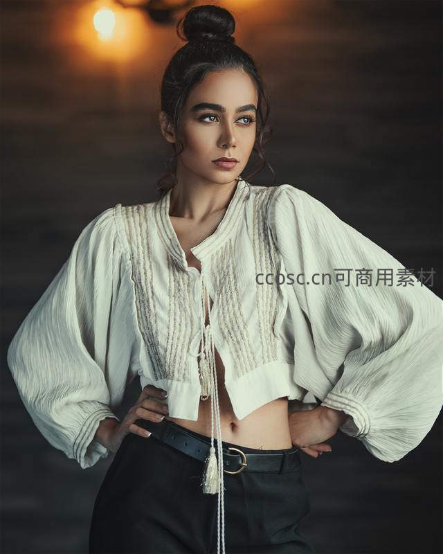 女性身着带有民族刺绣的白色泡泡袖短上衣,搭配黑色高腰裤和金色腰带,高盘发髻,姿态自信,充满复古时尚魅力。