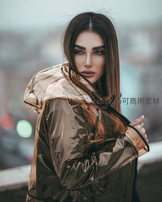 棕金色雨衣女子回眸凝视镜头瞬间