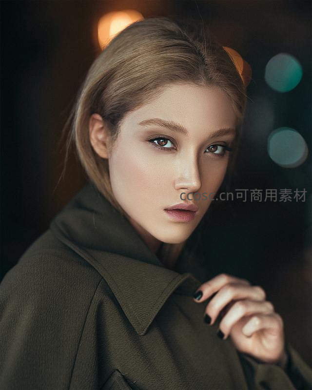 女子身穿深棕色大衣,侧颜回眸,暖黄灯光与背景光斑交相辉映,突显精致妆容与温柔气质。