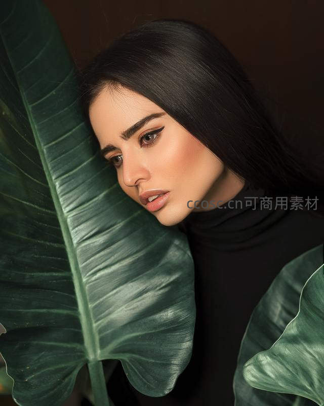 黑发女子轻靠宽大绿叶,眼神低垂,柔和光线勾勒面部轮廓,展现人与自然融合的宁静美感。