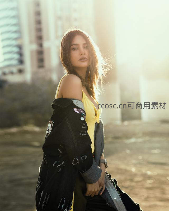 在温暖的午后阳光下,一位少女身穿亮黄色吊带上衣和黑色破洞夹克,站在高楼林立的城市背景前,侧身回眸,发丝被光线勾勒出金色轮廓。