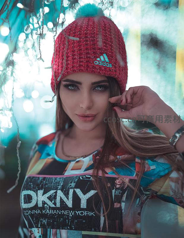 一位少女戴着红色Adidas针织帽,身穿印有DKNY图案的彩色T恤,在闪烁的灯光与水珠背景中摆出自然姿态,展现青春活力与街头潮流风格。