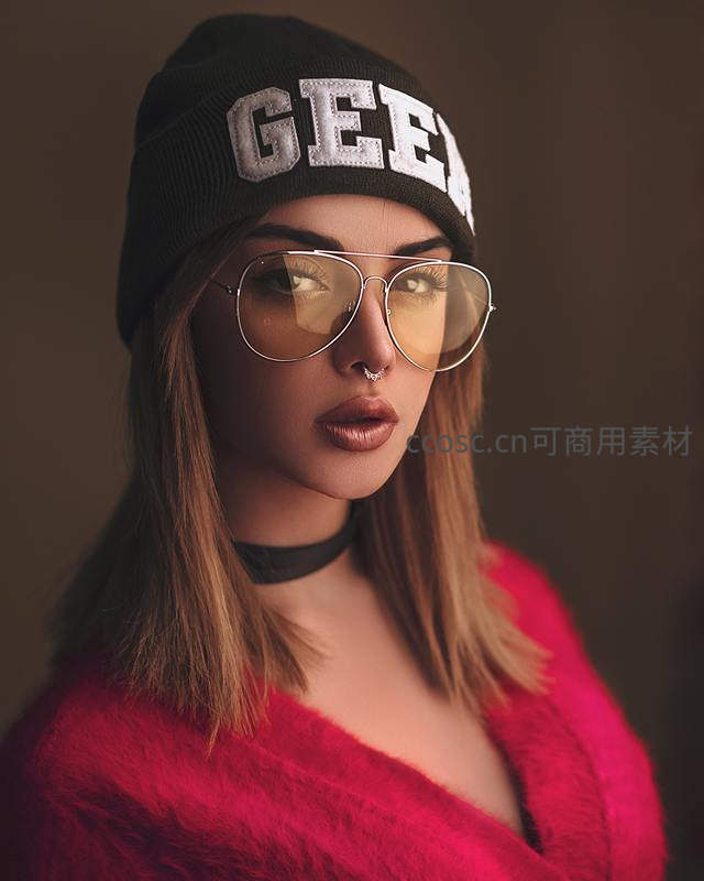 一位时尚女性头戴印有“GEEK”字样的黑色针织帽,佩戴飞行员墨镜和鼻环,身穿亮粉色毛绒上衣,眼神锐利,完美诠释了酷炫个性的街头潮流风格。