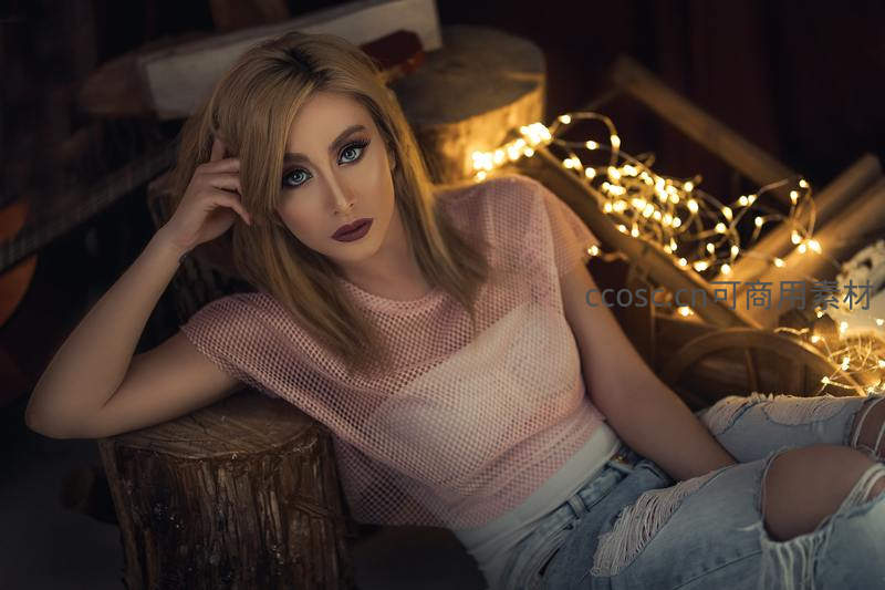在温暖串灯映衬下,一位少女身穿粉色网纱上衣与破洞牛仔裤,倚靠在木桩上,神情放松,背景中的吉他增添文艺气息,营造舒适惬意的居家氛围。