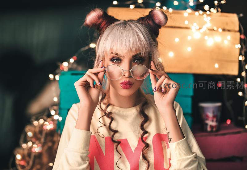 银发少女梳着俏皮双丸子头,手持圆形眼镜,背景点缀温暖灯串,营造出活泼又带点文艺气息的氛围。