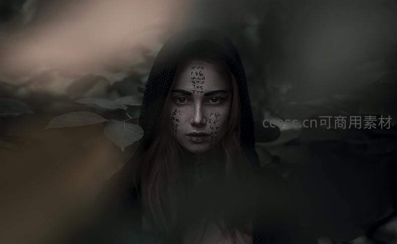 女子头戴黑色兜帽,面部绘有神秘符文,在朦胧森林背景下若隐若现,营造出幽深奇幻的氛围,充满艺术张力。