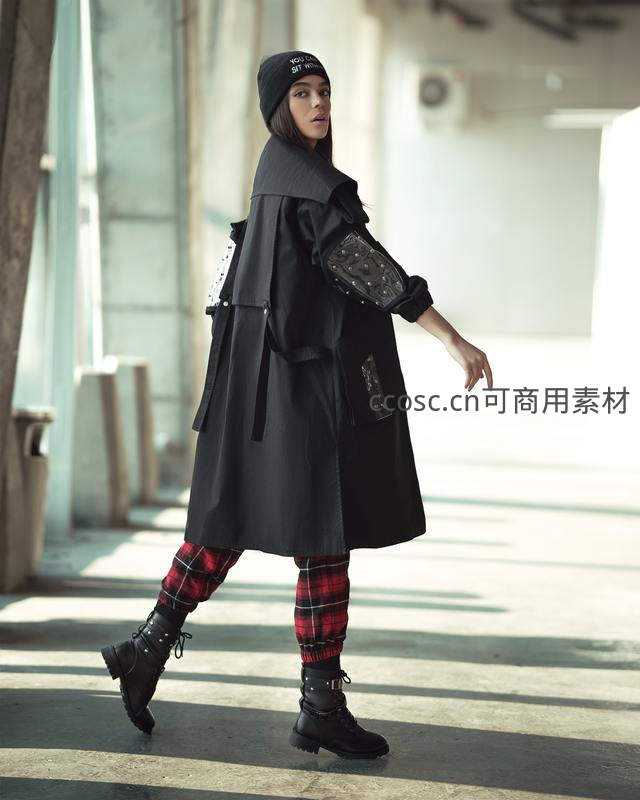 一位年轻女性身着黑色长款风衣与红黑格纹裤,搭配黑色马丁靴和针织帽,在阳光斑驳的工业风走廊中自信行走,展现个性街头风格。