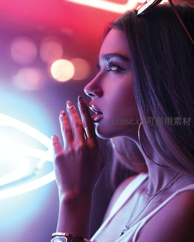 在炫彩霓虹灯光映衬下,女子侧脸轮廓分明,眼神迷离,营造出充满未来感与都市夜生活的神秘时尚氛围。