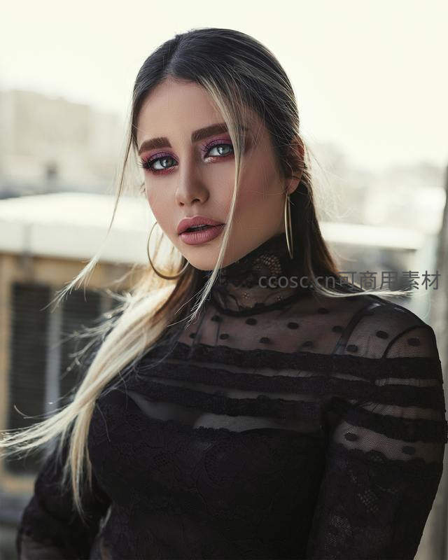 一位女性身着黑色蕾丝透视上衣,搭配精致紫色眼妆与金色大耳环,展现现代时尚与性感魅力。
