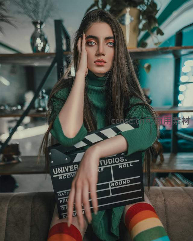 长发女子在复古工业风咖啡馆内抱着电影拍板,眼神专注,搭配精致眼妆与绿色针织衫,营造出安静又充满故事感的文艺人像画面。