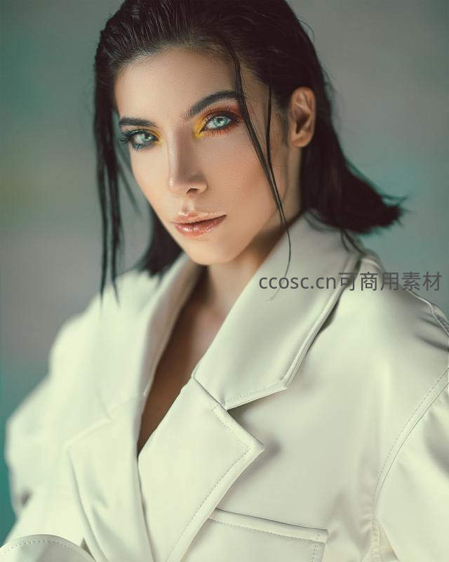 时尚女性白色外套特写,精致妆容与冷艳眼神