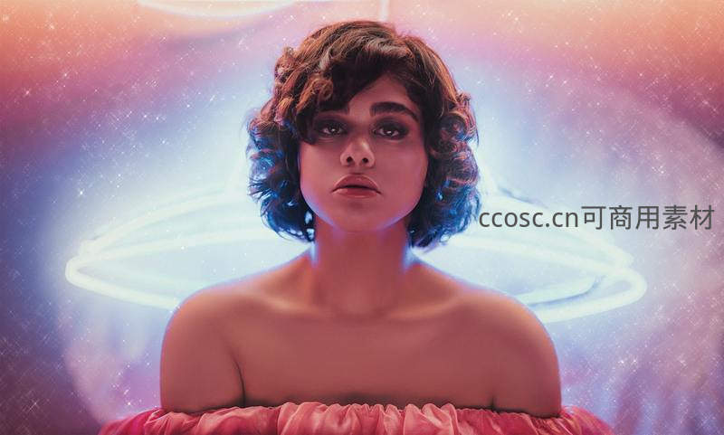 一位拥有蓬松卷发的年轻女性,在梦幻般的霓虹光环与星点背景中,以沉静而富有表现力的眼神直视镜头,营造出超现实的艺术氛围。