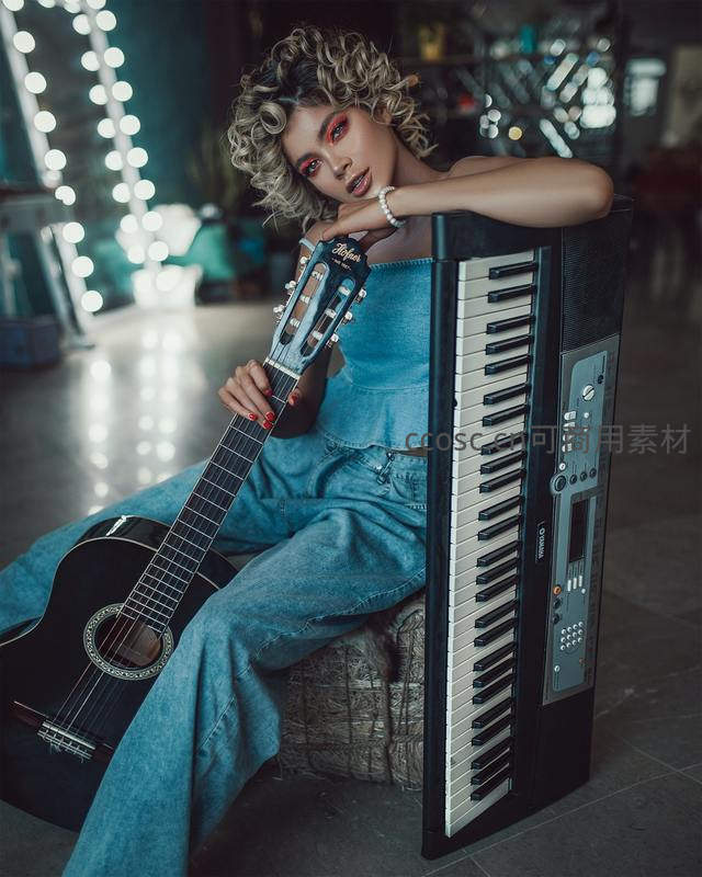 身着蓝色牛仔套装的少女,怀抱黑色古典吉他,侧身倚靠在电子琴旁,眼神温柔,背景灯串闪烁,营造出温馨惬意的音乐生活场景。
