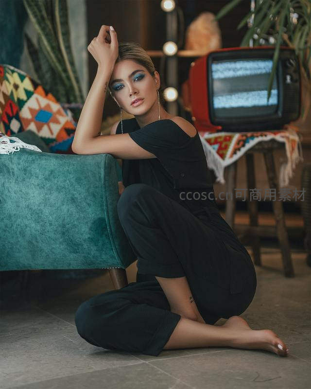 女子以蓝色眼影点缀,轻抚秀发,身着黑色上衣,置身于充满复古元素的客厅中,散发慵懒而精致的气息。