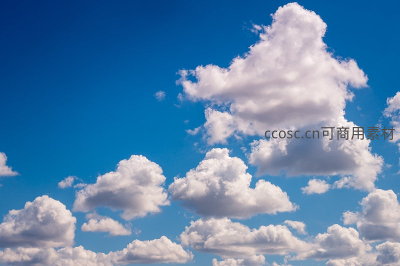 一片纯净的蔚蓝天空中,散布着形态各异、蓬松柔软的白色云朵,如同散落的棉花糖,令人心旷神怡。
