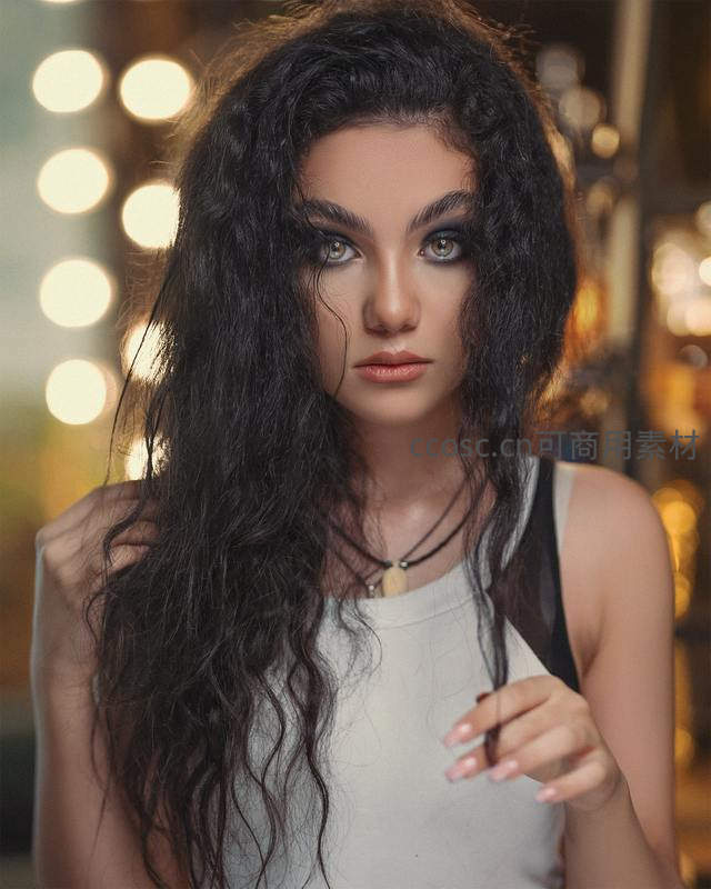 镜头聚焦于一位拥有浓密卷发与精致妆容的女性,背景灯光朦胧温暖,她眼神深邃迷离,营造出神秘而优雅的视觉氛围。