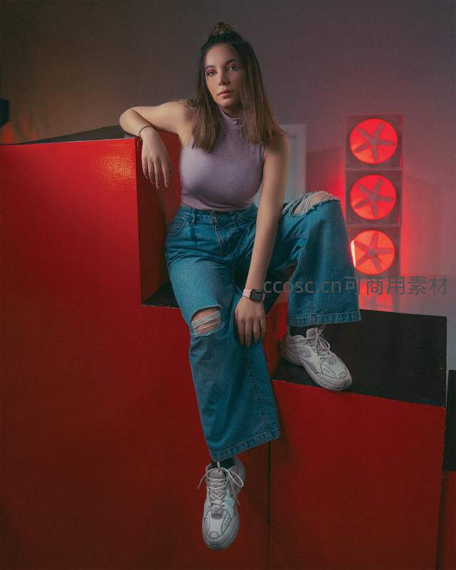 一位年轻女性倚靠在鲜红色的几何结构上,身穿紫色无袖上衣和破洞阔腿牛仔裤,搭配白色运动鞋,展现出青春活力与街头时尚感。