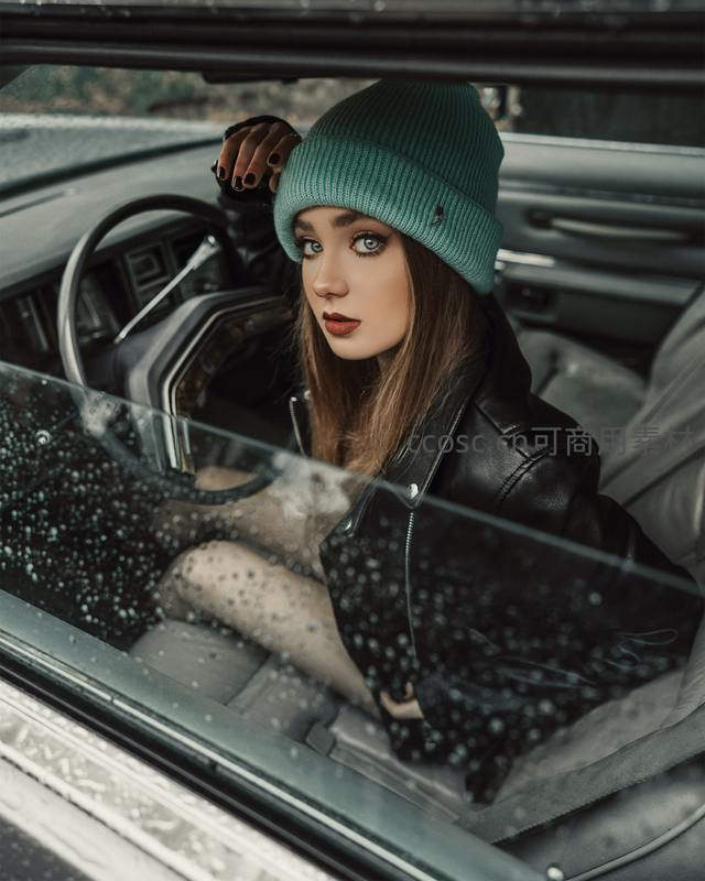 少女戴着绿色针织帽,身着黑色皮夹克,坐在复古汽车内,透过布满水珠的车窗凝视镜头,营造出冷冽又迷人的氛围。