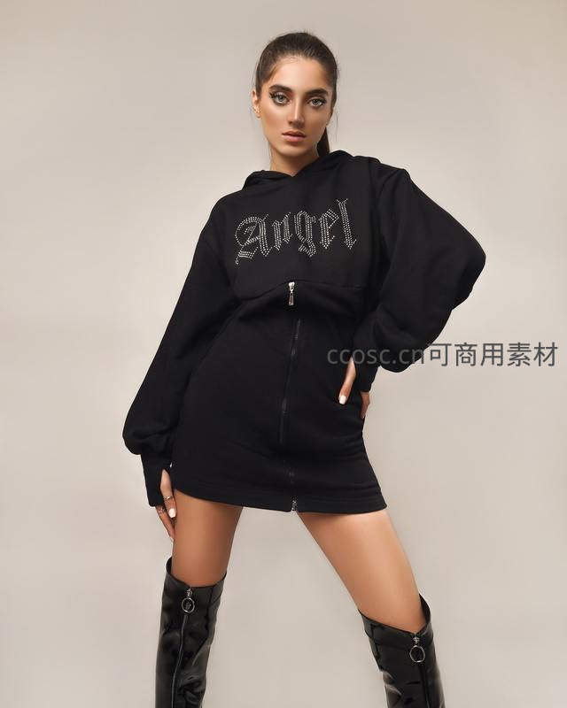 模特身穿黑色镶钻Angel连帽裙,手插口袋站立姿态自信,搭配高筒皮靴尽显酷飒风格,简约背景凸显服装细节。