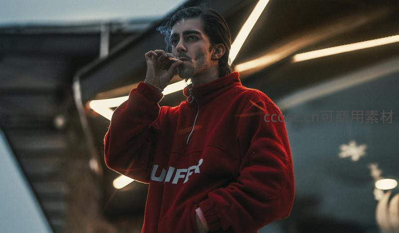 男子身着红色印花卫衣于夜晚街头抽烟,暖光灯带与冷色背景形成对比,营造出沉静又略带忧郁的都市青年氛围。