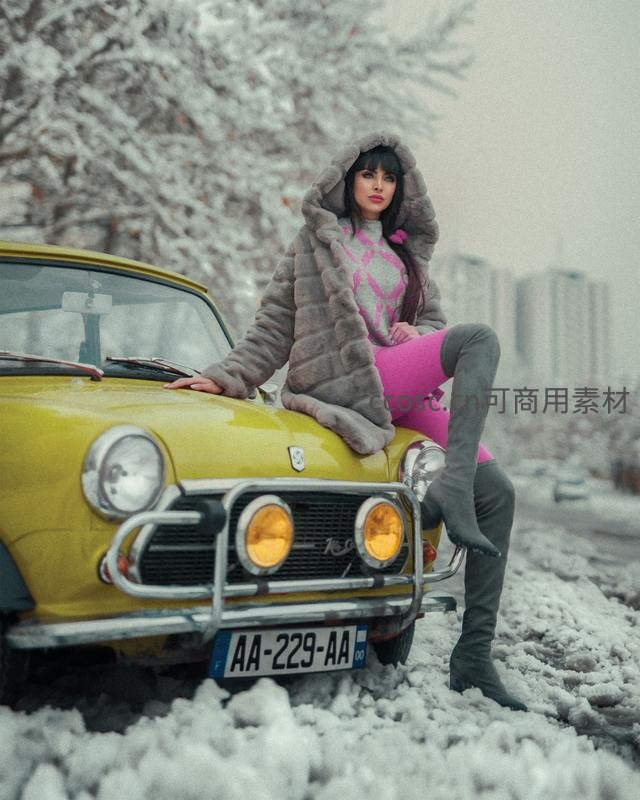 雪天街道上,一位身着灰色毛绒连帽外套与粉色紧身裤的女子,优雅地倚靠在一辆亮黄色复古汽车引擎盖上,背景是模糊的城市建筑。