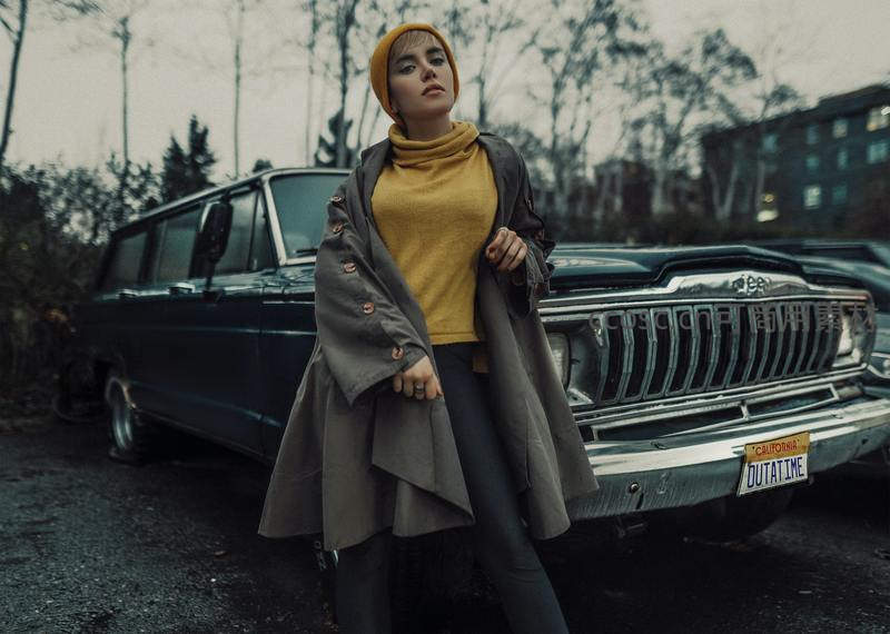 一位头戴黄色针织帽、内搭姜黄色高领毛衣的女子,披着灰色风衣站在一辆深色复古吉普车前,背景是萧瑟的树木和老旧楼房。