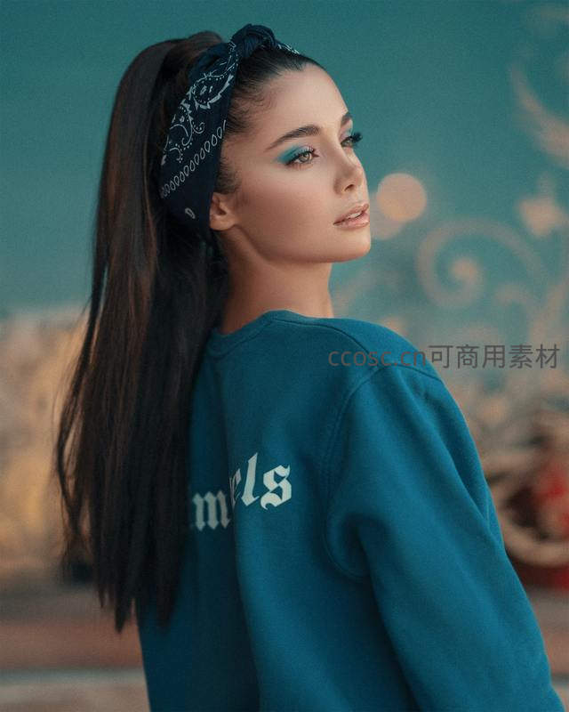 少女侧脸凝视远方,蓝色眼影与深色发带相映成趣,背景虚化营造梦幻氛围,突显其精致五官与时尚穿搭风格。