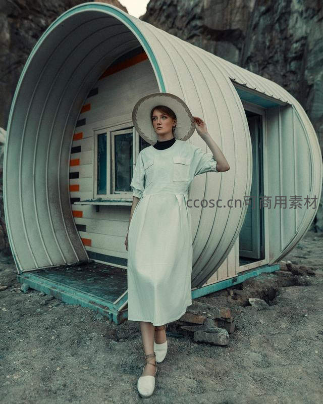 女子站在未来感十足的胶囊式小屋前,身穿简约连衣裙,手扶帽子,背景是粗犷岩壁,营造出科幻与自然交融的视觉张力。
