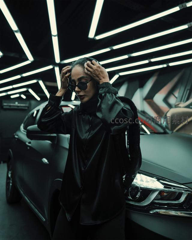 霓虹灯下黑衣女子与豪车的时尚瞬间