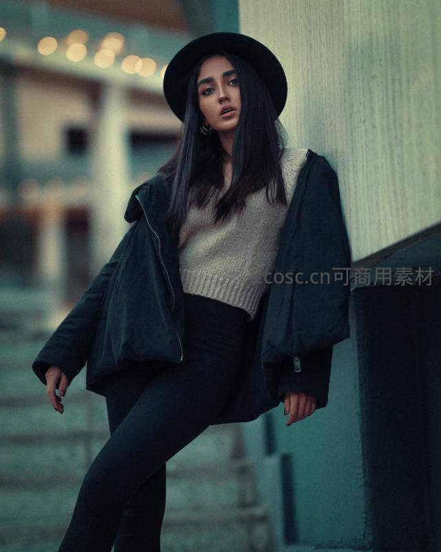 一位年轻女性身着黑色宽檐帽与宽松外套,倚靠在城市建筑墙边,姿态随性自然,背景虚化灯光营造出都市夜晚的浪漫氛围。