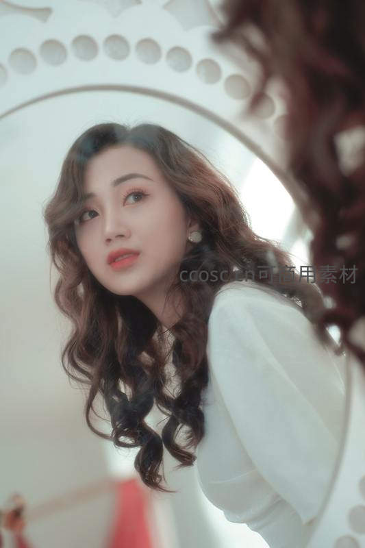 女子留着蓬松卷发,身穿白色泡泡袖上衣,在圆形雕花镜前侧颜凝望,柔和光线映衬出温婉神情与精致妆容,氛围宁静而优雅。